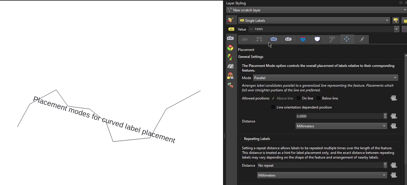Newly added placement "modes" are now available for use with curved labels, allowing for much more fine-grained control over how text is positioned when using curved labels, in line with QEP 404.